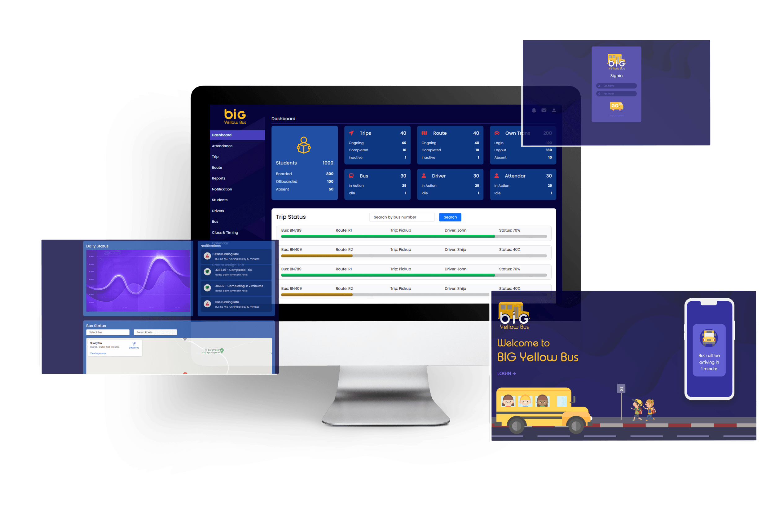 Big Yellow Bus has three level software with School login, driver login and parent login. Students tap on the RFID reader device installed on the school bus while entering and exit. Their log in and log out location is captured along with the time during tap. Thus attendance is updated in the school’s portal and parent mobile application real-time. Driver or the bus attendant can view the student count and their attendance from their mobile application which increase the student safety.